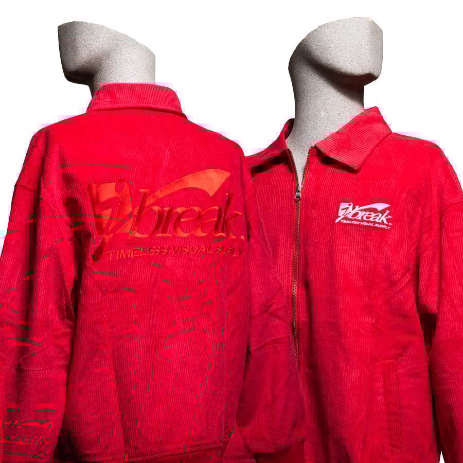 New Corduroy Harrington jacket by Joybreak. Ribbed corduroy cotton, Jbreak embroidery front & back featuring a pointed collar, full-length front zip closure and elastic banding at cuffs and hem. Finished with slip pockets at the waist.
